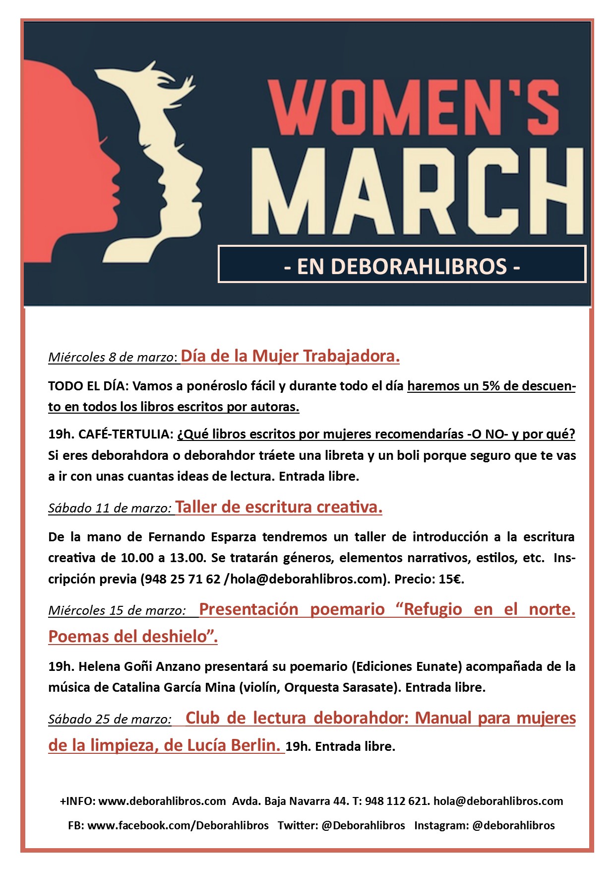 Cierro una semana. Como lo leéis. Que si esto es mi proyecto personal, mi librería soñada, mi granja en África que diría la Dinesen, pero la semana que viene chapo el chiringuito. Espero recargar pilas porque el menú de marzo viene con platos jugosos. Vamos a celebrar el día 8 como se merece. Los libros escritos por mujeres estarán más baratos ese día para fomentar su lectura y porque le da la gana a la librera, sin más. También se me ha ocurrido convocar a deborahdoras y deborahdores a las 19h para hablar de libros escritos por mujeres y sacar una buena lista de sugerencias de lectura o una lista de «No leer ni de coña», ya veremos. El día 11 vamos a tener un taller de escritura creativa. SI LLAMÁIS PARA APUNTAROS LA SEMANA DEL 28 NO COGERÉ EL TELÉFONO, que cierro, gente. «Apuntarsen» esta semana o la del 7. El día 15 tendremos en la librería a dos mujeres: una presentará un poemario inspirado en Escocia y la otra le acompañará con música de violín. El último sábado de marzo tendremos un club de lectura deborahdor a la altura de nuestro mes, con una mujer que peleó -y se desfondó- contra demonios, le dio por escribirlo y lo hizo de maravilla. ¡Os espero a todas!