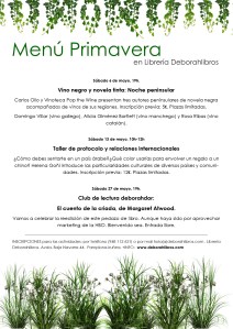 Qué mes de mayo, qué selva he montado en la cabecera y qué chulas las actividades… Vuelve el Vino negro, novela tinta a Deborahlibros el sábado 6 con un autor y dos autoras imperdibles presentados por Carlos Ollo gracias a los cuales probaremos vino catalán, gallego y manchego de Vinoteca Pop the Wine. Plazas limitadas, ya sabéis, hay que reservar sitio por teléfono o e-mail. El sábado 13 tenemos a Helena Goñi con un taller que me tiene fascinada ya sin haberlo catado: Protocolo y relaciones internacionales, que no es saber cómo saludar al obispo, gente, es conocer las costumbres y diferencias culturales de otros países y comunidades para no meter la pata. Se verán particularidades de países árabes, China, Japón, EEUU y más cosas jugosas como comunicación no verbal y si da tiempo «El arte de invitar». Por si fuese poco acaban de reeditar «The Handmaid’s Tale», (a.k.a. «El cuento de la criada») de DOÑA Margaret Atwood y a mí me ha faltado tiempo para meterlo en el club de lectura. Aunque no vengáis a comentar la jugada, leedlo. Leedlo muy fuerte.
