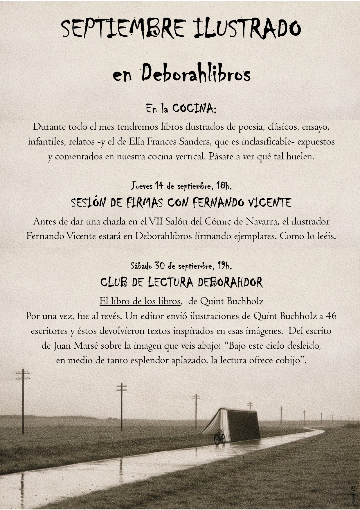 uier momento vamos a ver aparecer el carro del castañero, seamos realistas. Ese empezar a ponernos capas cual cebollas y ese «cielo desleído» que dice Marsé invitan a agarrar un libro como quien busca el último tablón del Titanic. Para ayudar, este mes lo dedicamos a los libros ilustrados. En nuestra cocina vertical recién inaugurada expondremos joyitas para grandes y pequeños de todos los palos imaginables: clásicos de la literatura universal, ensayo, escritos satíricos, poesía, relatos, cuentos infantiles o historias sin palabras. Encontraréis reseñas e información sobre ilustradores desmenuzada entre los ejemplares. El jueves 14 recibiremos a Fernando Vicente y el club de lectura deborahdor vamos a dedicarlo a «El libro de los libros». Con semejante título nada puede salir mal. Está compuesto de cuarenta y seis escritos inspirados en ilustraciones de Quint Buchhold, un impresionante homenaje de los que escriben a quien dibuja libros por todas partes.