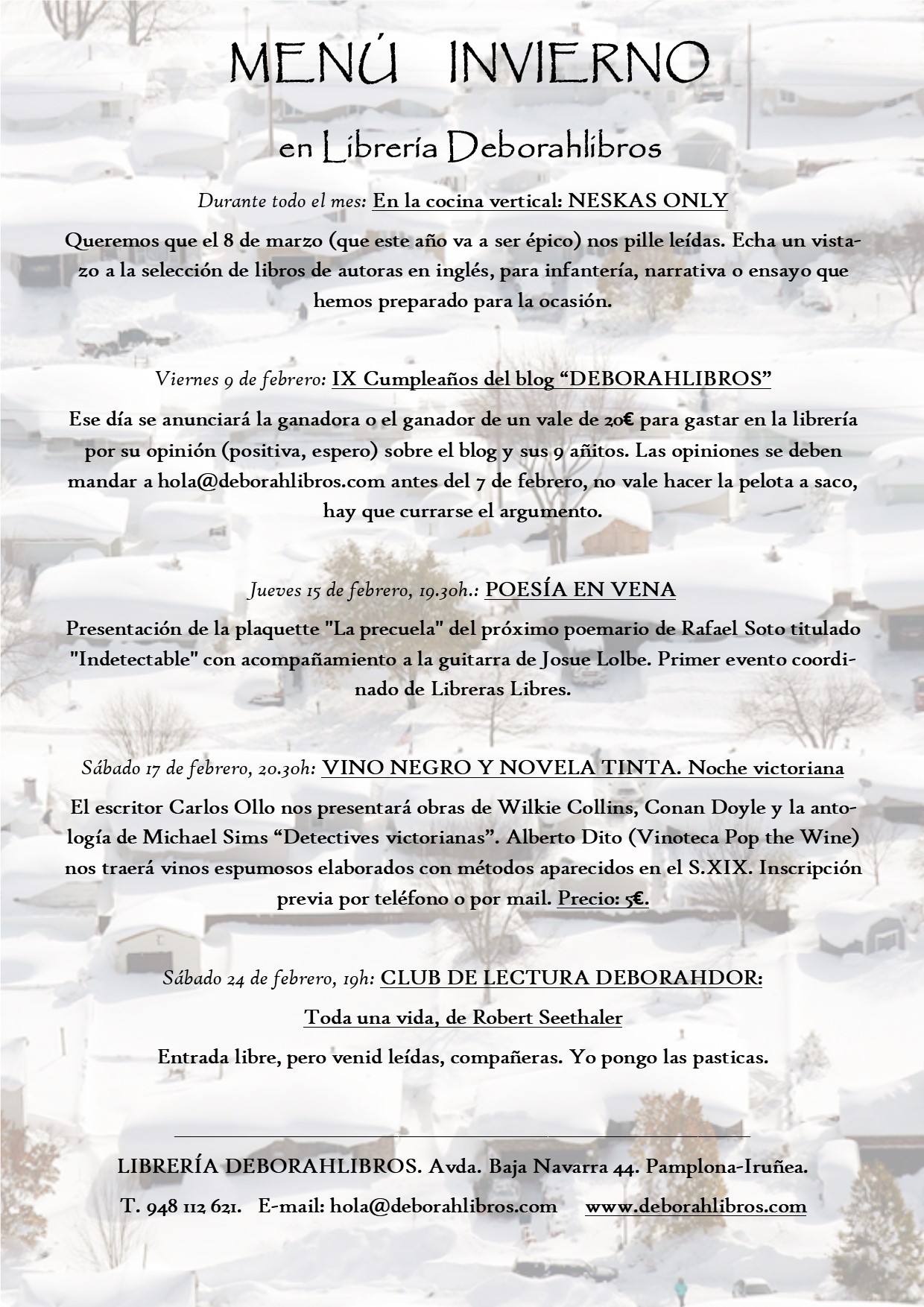 Se dice, se cuenta, se rumorea que se nos parte el vórtice polar y que llega lo que viene siendo un frío que pela. Esto a las deborahdoras no nos afecta tanto como a otras especies porque la lectura puede y debe practicarse tanto en sofá con mantita como sobre toalla en piscinita. Lo mismo nos da. Para este mes de febrero (EL mes, MI mes) hemos preparado munición para que el 8 de marzo nos pille leídas (encontraréis una estupenda selección de autoras en la «Cocina vertical»), una noche de autores victorianos regados con espumosos (OJO con el horario que hay cambios), una presentación original como ella sola del primer poemario de Rafael Soto (con acompañamiento musical incluido) y un club de lectura dedicado a un librito que promete pero no sabemos si ensalzaremos o destrozaremos alrededor de unas pastas porque todavía no lo hemos leído. Sorpresa. El día 9 de febrero este blog que estás leyendo cumple 9 años y lo celebramos invitando a libro(s) a alguien. Reconozco que me hace ilusión a la par que me fascina la trayectoria (Blogger—>Wordpress—>Librería física) de aquella pedrada que empecé en el invierno de 2009. Para ver todos los detalles, PINCHAD EN LA FOTO. Os veo entre nevada y nevada, gente.