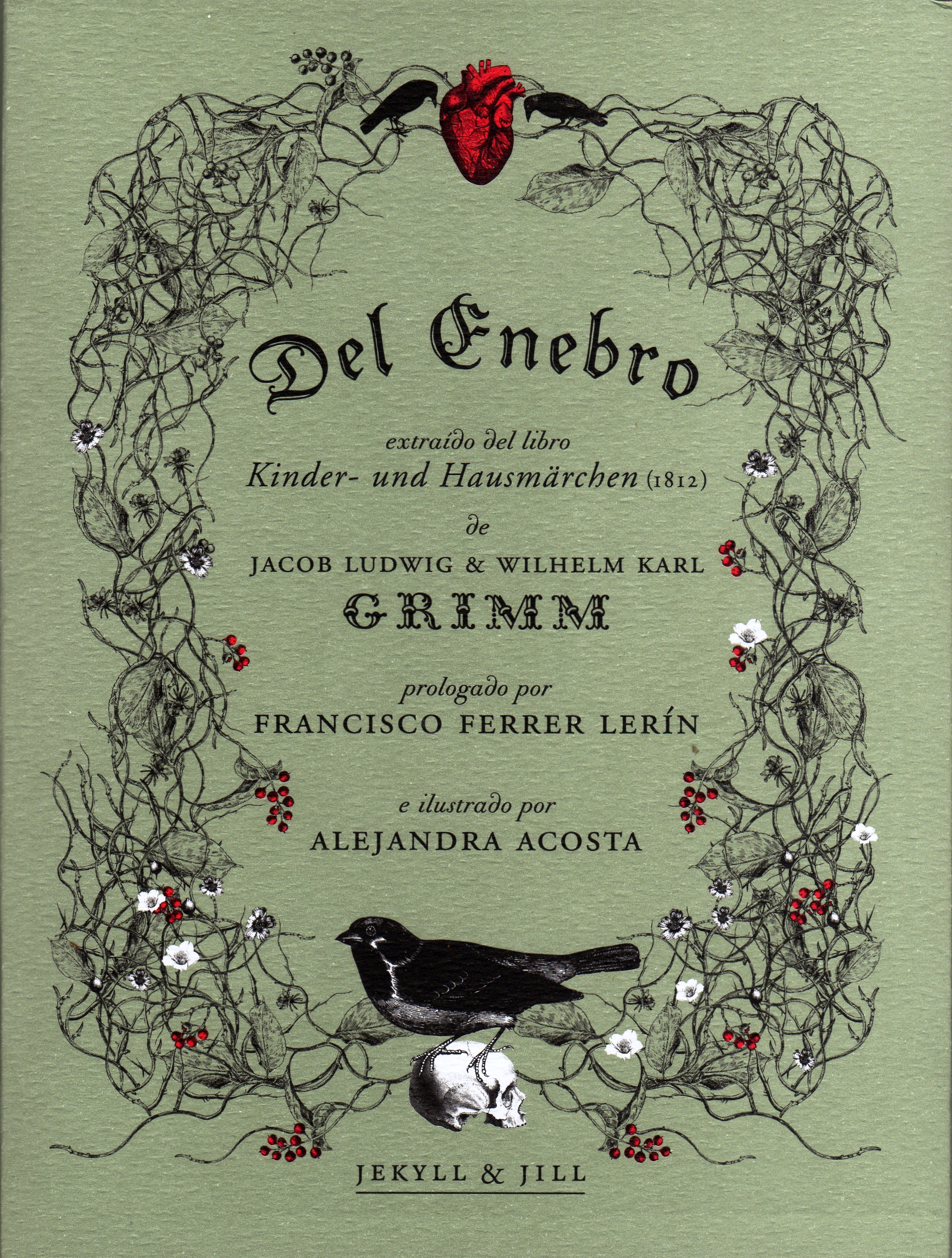 una leyenda urbana, hubo quien me preguntó «¿Tú tienes un enebro?» casi a media voz, como quien habla de sustancias estupefacientes ilegales. Estas navidades se ha reeditado y ya tengo mi enebro. Os puedo asegurar que la leyenda estaba cimentada en sólidos argumentos, el libro en sí es una joyita: el papel, las ilustraciones, las tintas y los cordeles pegados a mano por el editor en cada ejemplar numerado. Hay más curro en uno de estos que en todas las reimpresiones del último Planeta, qué os voy a decir. La enjundia reivindica (prólogo e introducción incluidas) los cuentos tradicionales tal y como fueron paridos: con canibalismo, muertes y truculencias varias. Un quítame de ahí la versión Disney que te salpico de sangre. La infantería de los cuentos de los hermanos Grimm siempre las pasaron más que canutas para poder alcanzar la justicia poética, y esta no es una excepción. Nos ofrecen al ocasión de atesorar uno de sus cuentos -espléndido- en un soporte artesanal. Gracias, Jekyll&Jill, por la oportunidad.